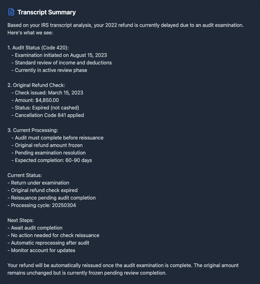 •Just used taxr.ai and here's what I got back: According to the analysis, my audit is focused on Schedule C income verification. They spotted the hold code on my transcript and explained I should expect resolution within 60 days. Super helpful!