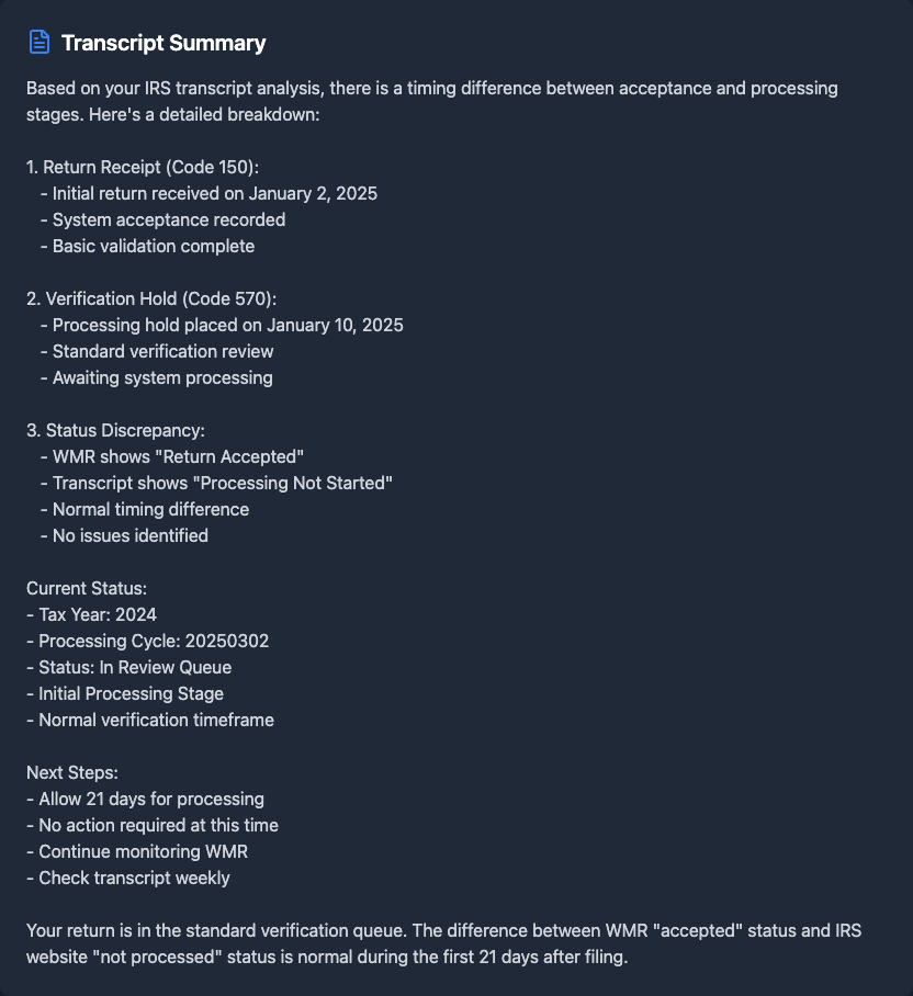 •okay i tried taxr.ai and here's what I got back: It found that my return is actually being manually reviewed bc of a mismatch with my W2. Super helpful knowing what's actually going on