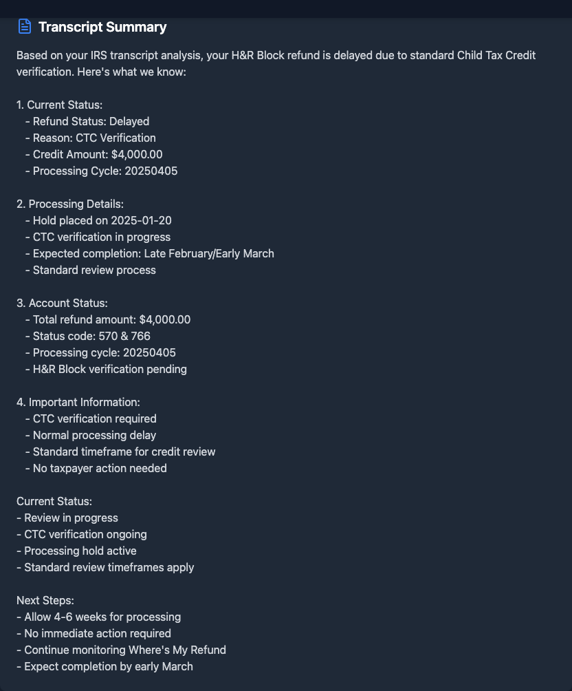 •It analyzes your tax docs and transcripts using AI to show exactly whats happening with your return. Can't speed up IRS but shows you what to expect and how to fix issues