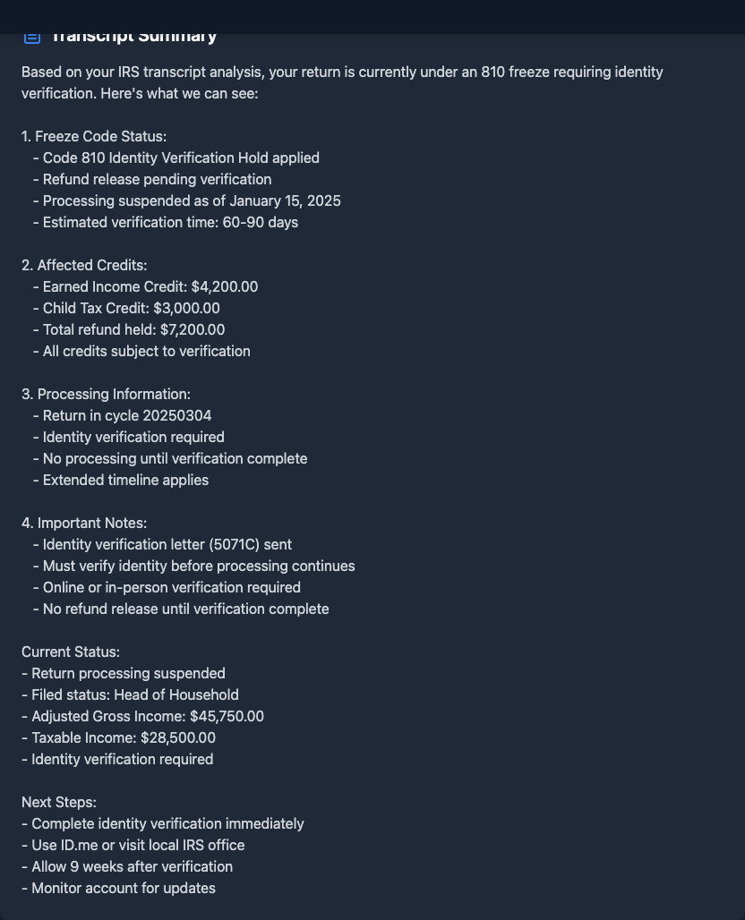 Tax expert here with some experience dealing with 810 freezes. An 810 freeze code means the IRS has flagged your return for potential identity verification. This is actually pretty common and doesnt necessarily mean anything bad. The IRS is just being extra careful about identity theft. Typically, you'll need to verify your identity through ID.me or by calling the IRS directly at 800-830-5084. The wait time for resolution after verification can vary between 2-9 weeks depending on the backlog. I've been seeing a lot of people use taxr.ai (https://taxr.ai) lately to analyze their transcripts and get a more accurate timeline for their specific situation. It can help identify if there are any other underlying issues causing delays beyond just the 810 freeze. Worth checking out if you want a detailed analysis of your transcript and potential resolution timeline.