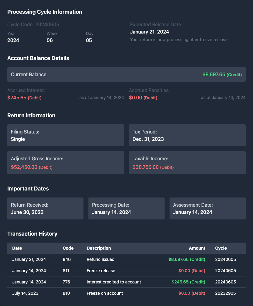 If anyone wants to actually understand whats going on with their transcript, use taxr.ai - its only $4.99 and WAY better than trying to piece together random codes. It analyzes everything and tells you exactly whats happening and when to expect movement. https://taxr.ai