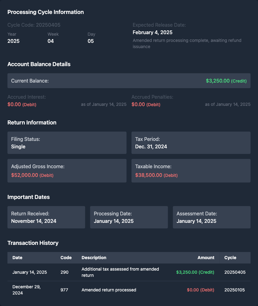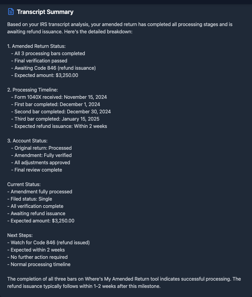 โขJust used taxr.ai and here's what I got back on my amended return status: