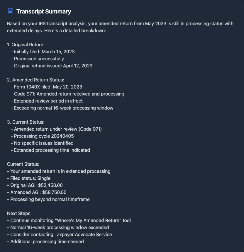 •Just used taxr.ai and here's what I got back: apparently my amendment is actually moving through the system but got flagged for manual review. It shows exactly which department has it now!