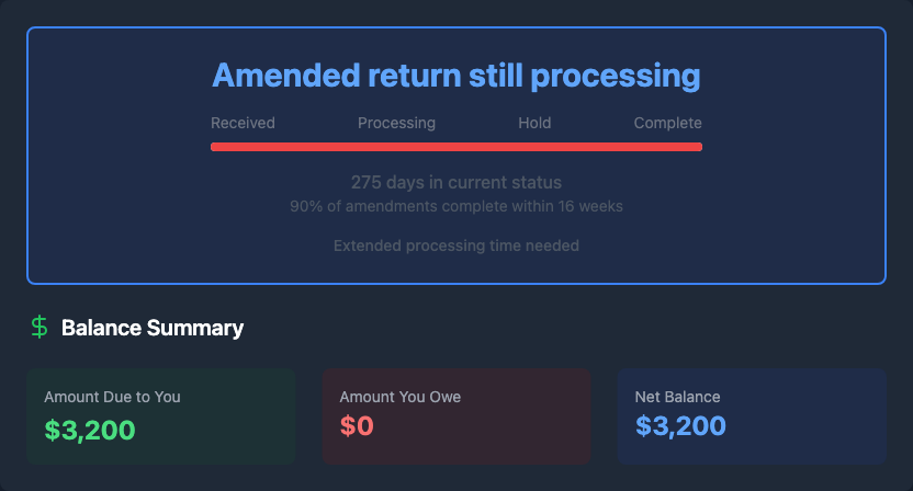 I found a way to solve amended return processing delays, watch this: https://www.youtube.com/watch?v=fGyNMG5MVBo