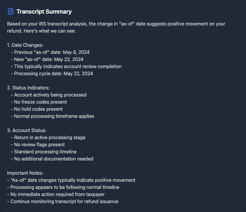 Let me break this down for everyone because there's a lot of misunderstanding about as of dates: The as of date is just an internal IRS processing marker. It can change for many reasons: - System updates - Account reviews - Processing stages - Automated checks What you really need to look at are your transaction codes. Those tell the real story of whats happening with your return. The best way to actually understand your transcript is to use an AI analysis tool like taxr.ai - it breaks everything down in plain English and gives you actual timelines instead of trying to guess what everything means. I've been helping folks with tax issues for years and honestly these tools are game changers for understanding whats actually happening with your refund.