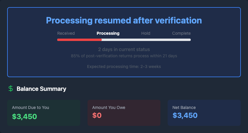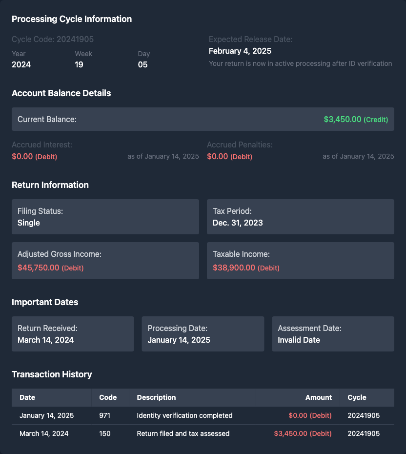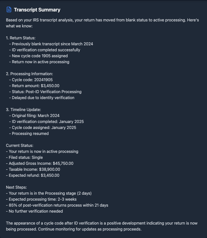 •Just used taxr.ai and here's what I got back: It analyzed my transcript and showed me I had a 571 hold that was resolved after ID verify. Says I should see my refund in about 2-3 weeks based on my cycle code!