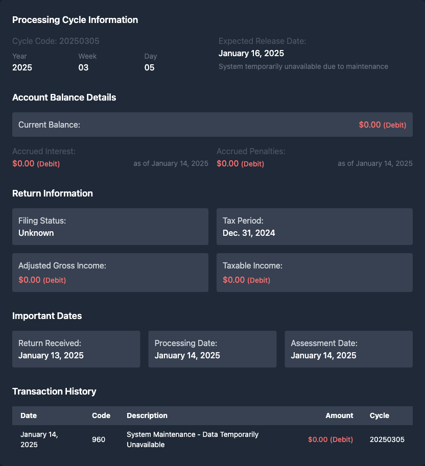 Filed back in February and my transcripts have been blank ever since. Was able to check Where's My Refund until about 2 weeks ago, but now that's gone too. Getting really worried since I can't see anything anymore. Called the IRS multiple times but just get the automated message about high call volume.