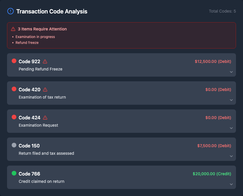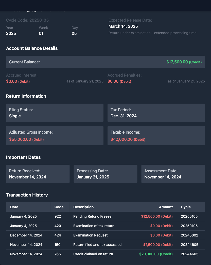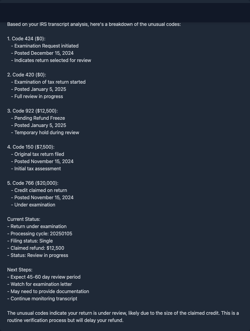 I've been staring at my transcript for hours and I'm so confused. I just got my IRS Account Transcript for tax period Dec. 31, 2023 dated 11-12-2024 (response date 11-09-2024), and there's all these numbers and codes that make no sense to me. The transcript shows my filing status as Single with an Adjusted Gross Income of $43,233.00 and Taxable Income of $29,383.00. My Tax Per Return was $4,185.00. What's really confusing me are all these transaction codes: - Code 150: Tax return filed on 06-17-2024 for $4,185.00 - Code 806: W-2 or 1099 withholding on 04-15-2024 for -$11,557.00 - Code 570: Additional account action pending on 06-17-2024 $0.00 - Code 971: Notice issued on 08-26-2024 $0.00 - Code 290: Additional tax assessed on 11-18-2024 $0.00 - Code 807: Reduced or removed W-2 or 1099 withholding on 04-15-2024 for $11,557.00 - Code 290: Another additional tax assessed on 11-25-2024 $0.00 - Code 196: Interest charged for late payment on 11-25-2024 for $159.81 - Code 276: Penalty for late payment of tax on 11-25-2024 for $127.40 - Code 971: Another notice issued on 11-25-2024 $0.00 My account balance shows $4,472.21 as of Nov. 25, 2024, with accrued interest $0.00 and accrued penalty $0.00. Some of these codes (like 570, 971, and 420 which I've seen on other transcripts) keep showing up and I keep googling but getting different answers everywhere. Why did they remove my withholding with code 807? And why did I get charged interest and penalties? Anyone know what these codes actually mean and if they're good or bad? Just want my refund already its been 3 months. Instead it looks like I might owe money now? I'm especially confused about the withholding being reduced after I filed.