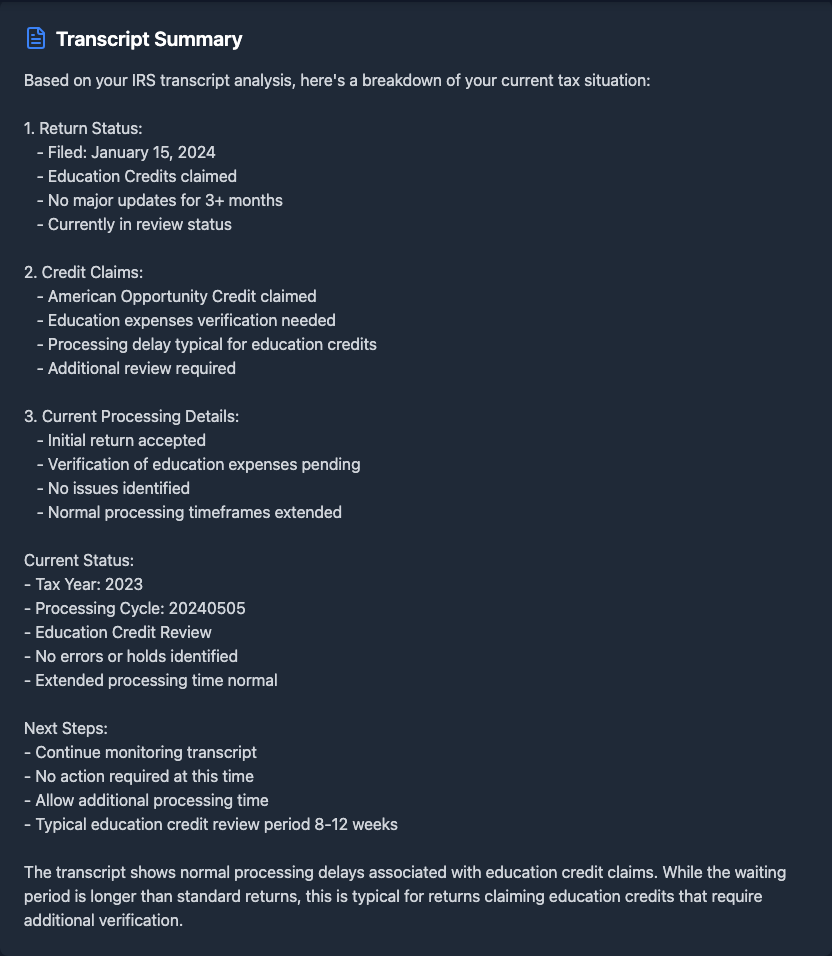 •It analyzes literally any tax doc - transcripts, w2s, 1040s, even IRS letters. Gives you specific dates and explains exactly whats holding things up. Been recommending it to all my clients