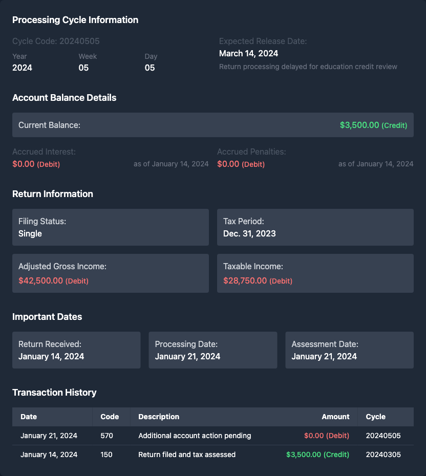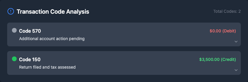 •The codes are usually on the right side of your account transcript, they start with numbers like 570, 971, etc. Each tells a different story about your return's status.