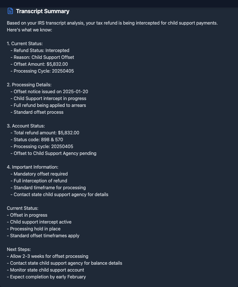 •It uses AI to analyze everything - offset history, payment patterns, codes, dates. Then gives you super specific info about your situation. Way better than trying to figure it out yourself!