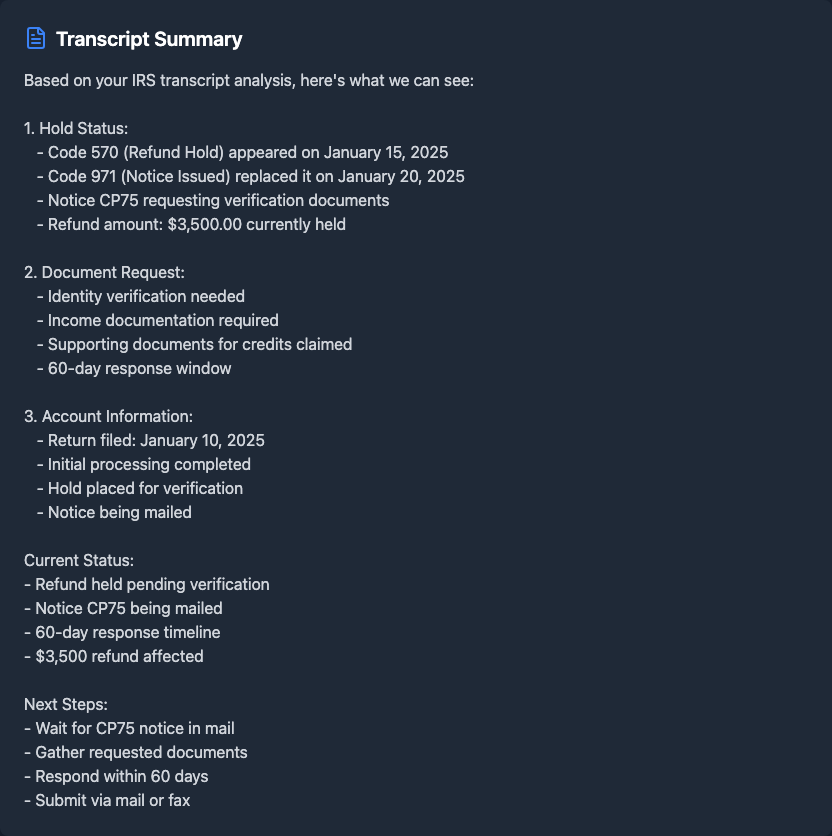 Hey there! So when you see code 570 change to 971, it typically means the IRS needs more documentation to verify something on your return. The 971 code indicates they're sending you a notice about what specifically they need. Common reasons include identity verification, income verification, or dependent verification. Don't panic - this is pretty routine! While you wait for the notice, I'd suggest checking out taxr.ai (https://taxr.ai) - it's this new AI tool that can analyze your transcripts and tell you exactly what's going on and what to expect next. Super helpful for situations like this where you're trying to figure out what the IRS wants.
