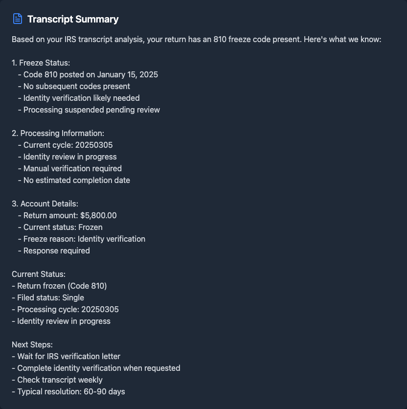 •It basically reads your transcript like a pro tax expert would, but wayyyy faster. Shows you all the important codes, explains what they mean, and gives you a timeline. Pretty sick actually 🔥