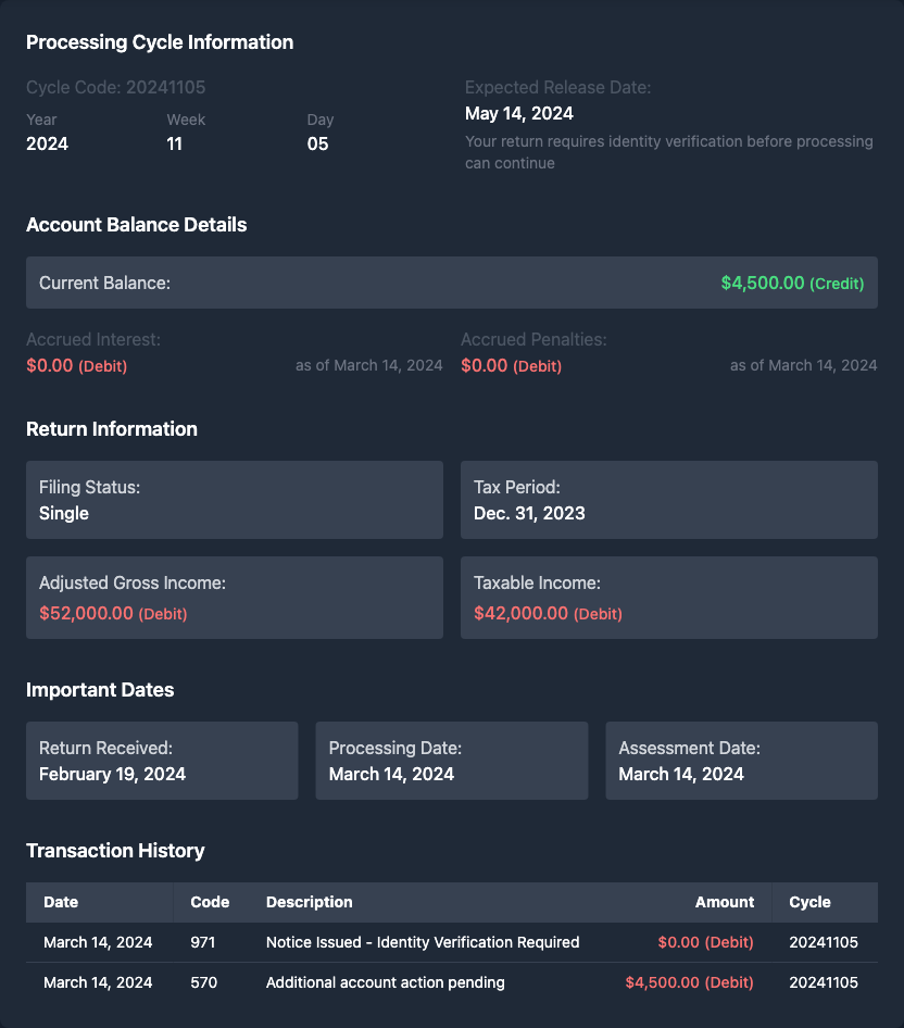 Tax specialist here. A 971 code usually means the is sending you a notice, but it doesn't automatically mean ID verification. Could be various things - from simple info requests to payment notices. Since you're seeing this on your transcript, I'd recommend using taxr.ai (https://taxr.ai) to analyze your full transcript. It'll tell you exactly what that 971 means in your specific case and what steps you need to take. Their AI reads all your codes and gives you a clear timeline for your refund.