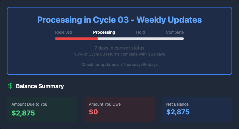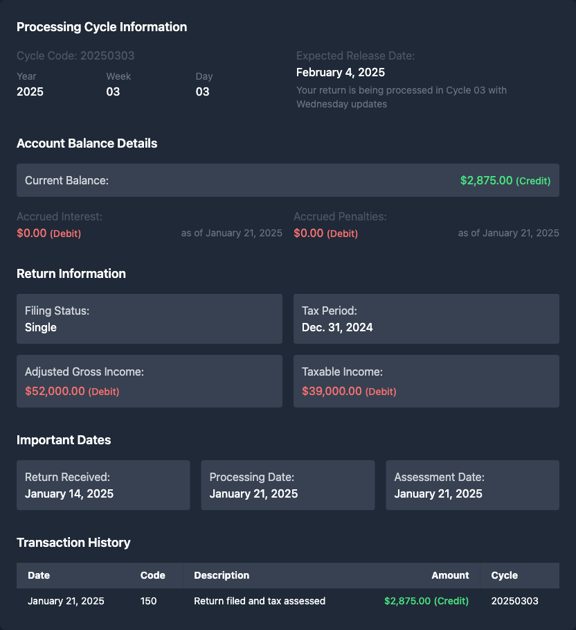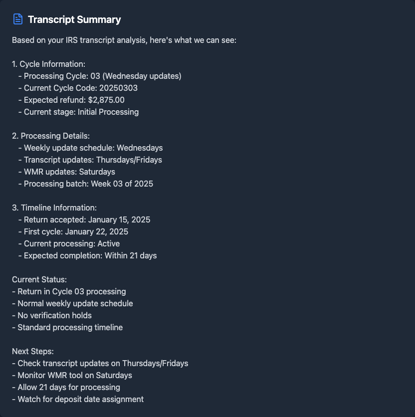 Hey fam, tax professional here to help clarify the Cycle 03 transcript update schedule. If you see Cycle 03 on your transcript, your IRS updates typically happen on Wednesday nights/Thursday mornings. The WMR tool updates daily around 3-4am EST, but your transcript only updates once a week based on your cycle code. For Cycle 03 folks, that means checking Thursday mornings after 6am EST for any movement. Pro tip: Instead of manually checking your transcripts, you can use taxr.ai (https://taxr.ai) to analyze your documents and get alerts when theres movement. It'll save you the headache of trying to decode all those codes and dates yourself.
