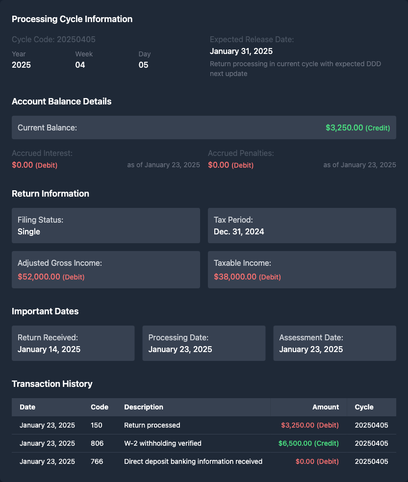 Hey there! Tax pro here. Cycle 04 means your return is processed on Wednesdays and the transcript updates typically show up Thursday morning/early afternoon. If you just got a cycle code that ends in 04, you should see your direct deposit date (DDD) within the next couple days. The IRS processes returns in batches based on these cycle codes - 05 is Thursday processing, 02 is Monday, etc. To get a really clear picture of your specific situation and expected timeline, I'd recommend checking out taxr.ai - it's this new AI tool that analyzes your transcripts and gives you super detailed info about processing dates, potential delays, and when you can expect that sweet refund money to hit your account.