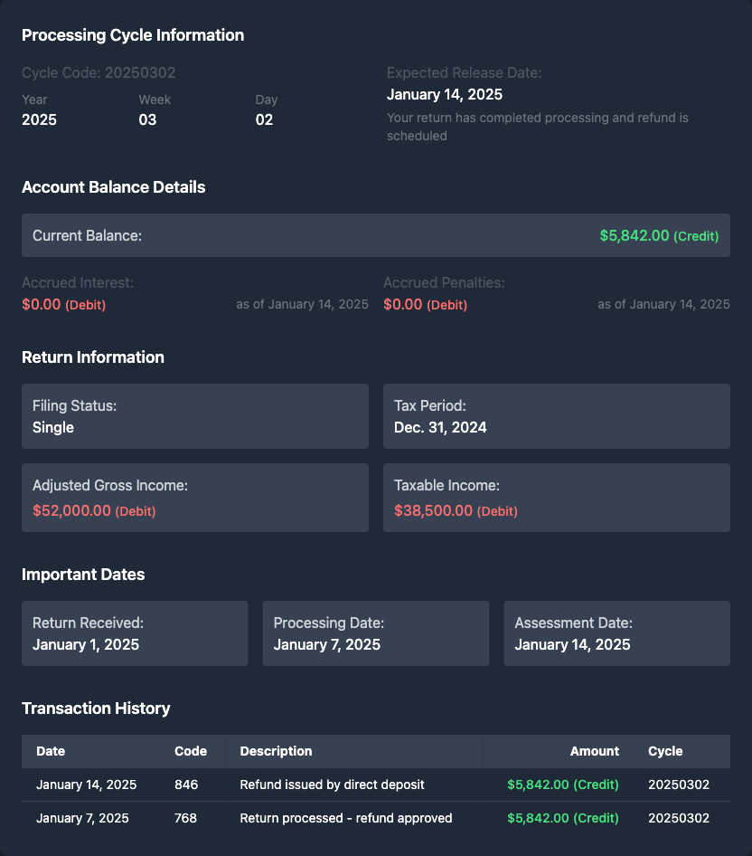 •Just used taxr.ai and here's what I got back: It analyzed my entire transcript and broke down every code. Super detailed! Actually predicted my deposit date exactly.