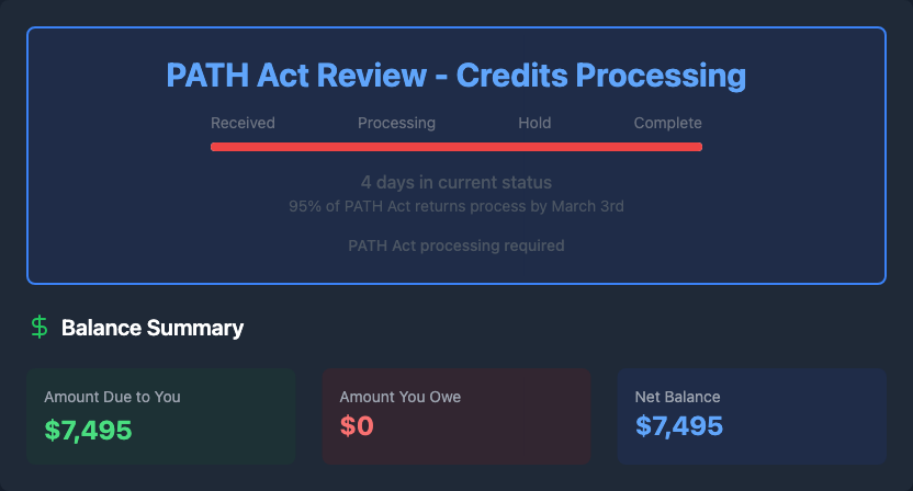 โขThat's normal with PATH Act. Run your docs through taxr.ai and it'll show you exactly where you are in the process and when to expect your $$