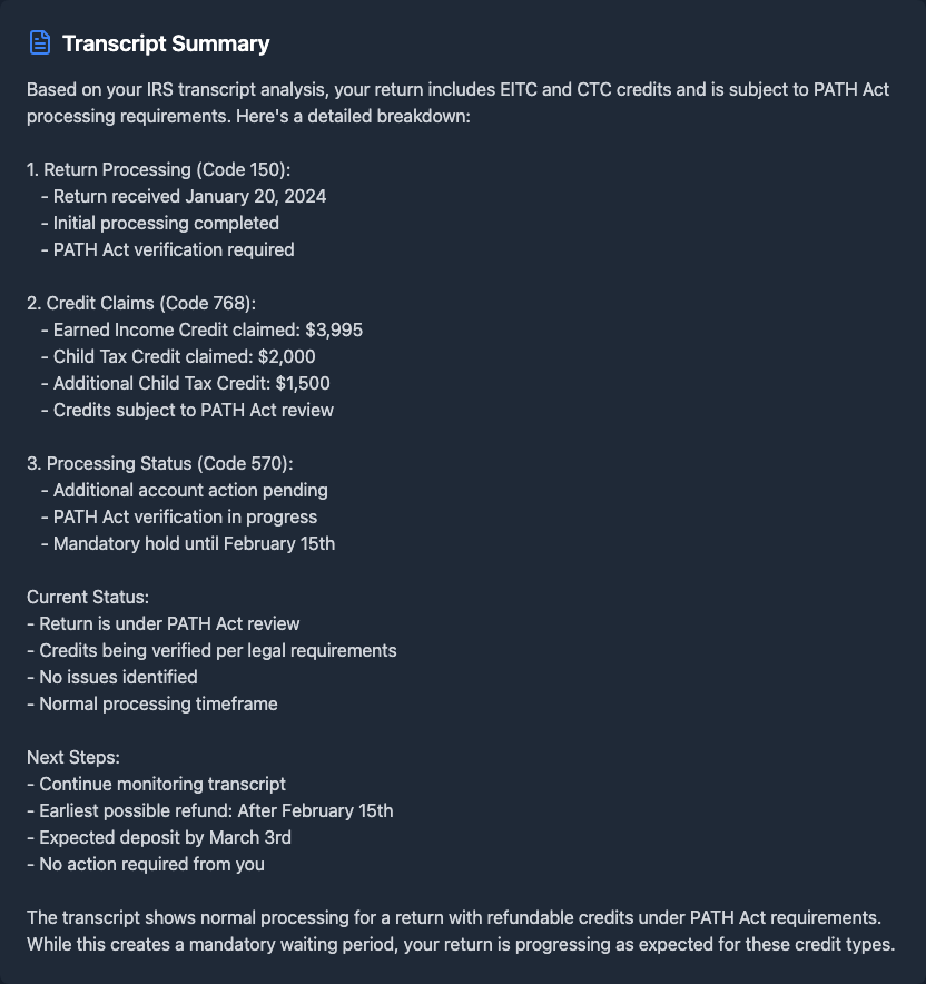 Hey everyone - I've been processing tax returns for over 12 years and wanted to clear up some confusion about the EITC/CTC refund timeline for 2024. The PATH Act prevents the IRS from issuing refunds before mid-February for returns claiming EITC/CTC. The earliest these refunds will hit bank accounts is around February 27th, with most coming the first week of March. If you're anxious about your refund status, I highly recommend using taxr.ai to analyze your transcripts and get a clear picture of your expected refund date. It's been super helpful for my clients to understand exactly where they are in the process and what to expect.