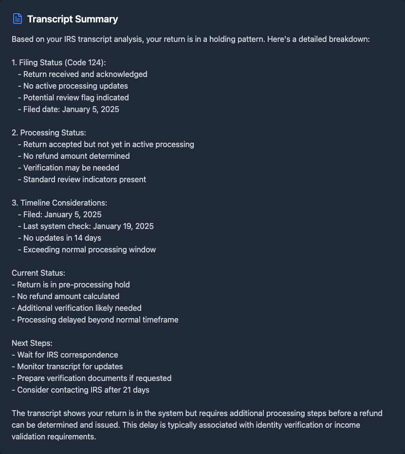 ā¢It can analyze pretty much any tax document - transcripts, W2s, 1099s, IRS letters, even TurboTax PDFs. The AI looks for specific patterns and issues that typically cause delays