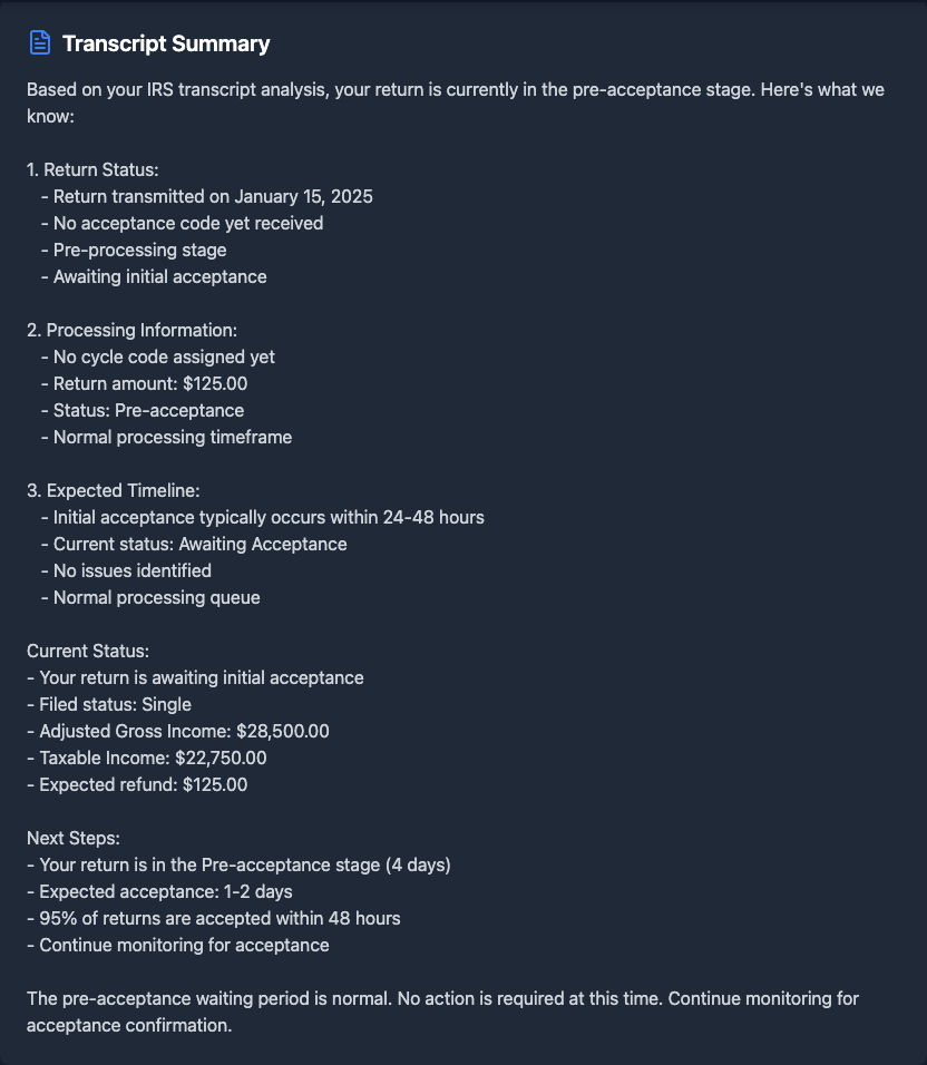 As a tax professional, I can tell you that the IRS is experiencing significant delays this year. While it's frustrating that your return hasn't been accepted yet, there could be several reasons for this. First, make sure your return was actually transmitted successfully - sometimes returns get stuck in transmission limbo. Second, check if you have any common red flags like missing documents or mismatched information that could trigger additional verification. I've been recommending taxr.ai (https://taxr.ai) to my clients lately - it's an AI tool that analyzes your tax documents and gives you specific insights about potential delays and exactly what's causing them. It can tell you if there are any issues that might be holding up your return from being accepted and what you can do about it. Keep in mind that processing times are varying widely this year, but most e-filed returns should at least show as 'accepted' within 24-48 hours. If it's been longer than that, you may want to double check your transmission status with your tax preparer.