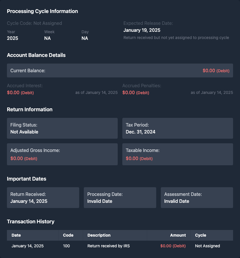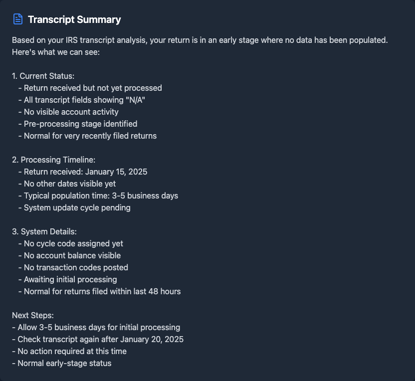 •It uses AI to analyze everything - all the codes, dates, amounts etc. Gives you a really detailed breakdown plus estimates your refund date. Super accurate too!