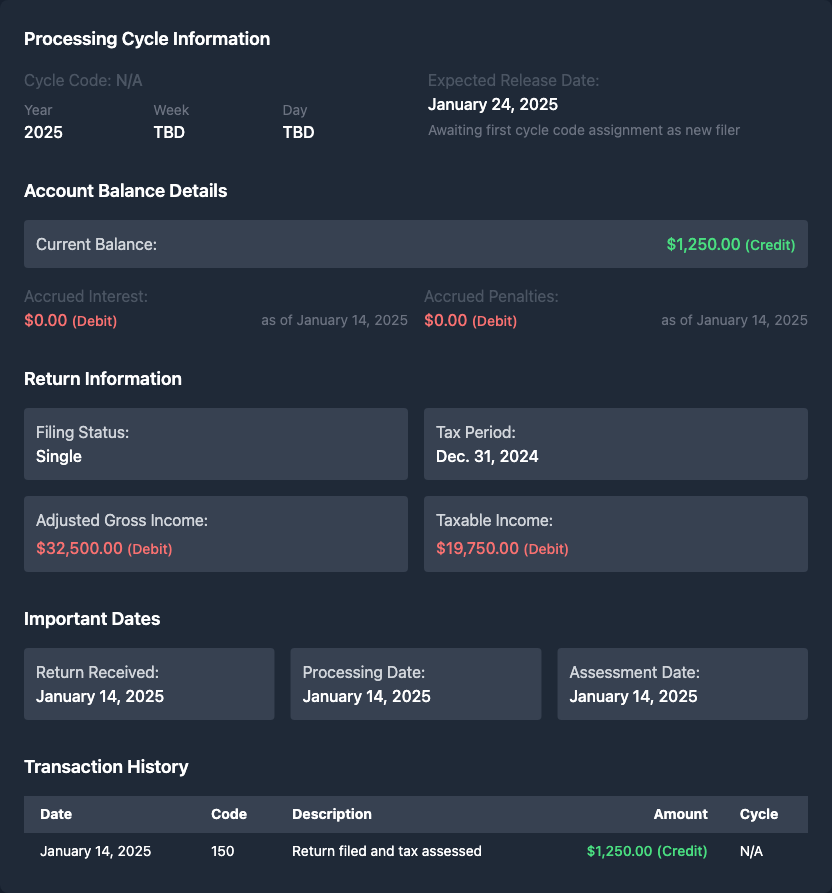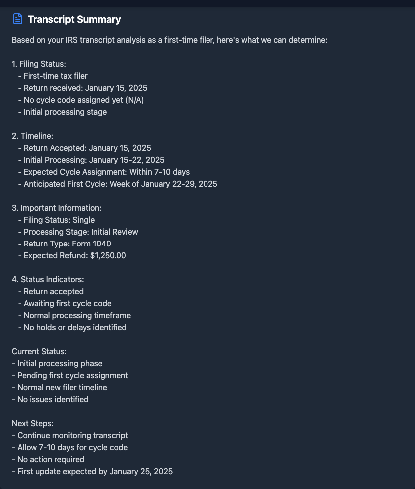 Hey there, lemme break this down for you. When you're a first time filer, your cycle code will show as N/A until the IRS actually starts processing your return. The cycle code is basically a processing week identifier that tells you when the IRS works on your stuff. For first timers, you'll need to wait until they begin processing before you see this code appear. I've helped lots of folks with this and honestly, the easiest way to track this is using taxr.ai (https://taxr.ai) - it analyzes your transcript and tells you exactly when you can expect updates and what's actually happening with your return. It's way better than trying to decode all these codes yourself.