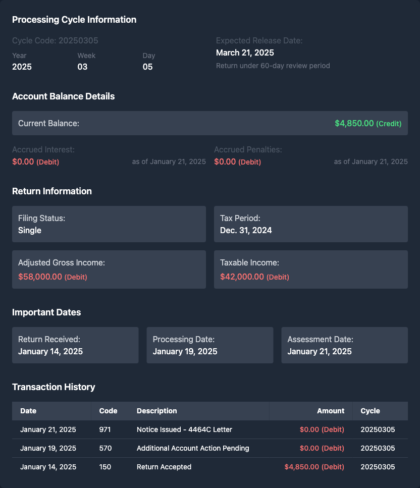 Just got a letter in the mail from the IRS (4464C) saying they need another 60 days to review my return. Checked my transcripts today and finally seeing some movement but these codes are like reading hieroglyphics. Anyone know what I'm looking at and if this means good news or more delays? I'm married filing jointly with 2 exemptions. Our AGI is $56,809.00 with a taxable income of $29,109.00. Our tax per return is showing as $3,835.00. When I look at the transactions section of my transcript, I can see: TRANSACTIONS CODE EXPLANATION OF TRANSACTION CYCLE DATE AMOUNT 150 Tax return filed 20241605 05-06-2024 $3,835.00 79211-429-31792-4 806 W-2 or 1099 withholding 04-15-2024 -$5,200.00 570 Additional account action pending 05-06-2024 $ The processing date shows as May 06, 2024, which I assume is when they started reviewing my return. I notice there's a code 570 for "Additional account action pending" which I'm guessing relates to the 60-day review letter. Our return due date (or received date) was Apr. 15, 2024. Our SE taxable income for both me and my spouse is $0.00 with total self-employment tax of $0.00. Does the code 570 mean they found a problem? And what's the deal with the withholding amount (-$5,200.00) versus our tax amount ($3,835.00)? Does this mean we're getting a refund eventually? I'm just trying to figure out if this is good news or if I should be preparing for a long wait or potential issues.