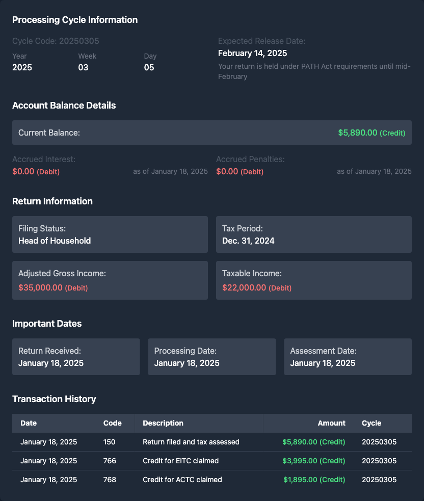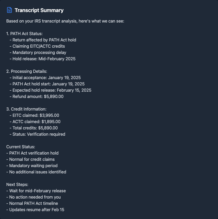 •It analyzes literally any tax document - transcripts, W2s, 1040s, even IRS letters. Gives you specific dates and explains any delays