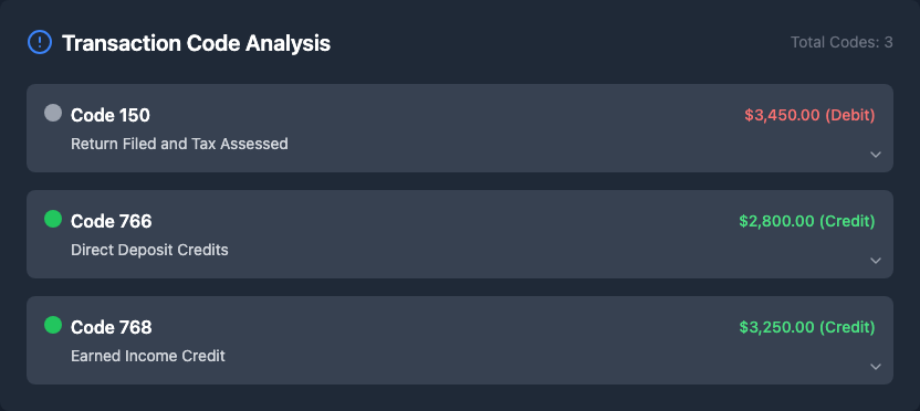 Help understanding IRS Transcript Codes 150, 766, 768 - What do they mean?