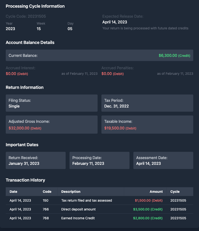 Hey @Mele Uluiviti! Just to add to what others have said - you're definitely getting a refund! 🎉 The way to think about it is: Code 150 is what you owe in taxes, and codes 766 & 768 are credits being applied to your account. Since those credits (the negative amounts) are larger than what you owe, the difference becomes your refund. The 04/15/2023 date is just when the cycles process - it doesn't mean you have to wait until then to get your money. Usually refunds with those codes process much faster. You should see your hit your account within the next few weeks if everything processes smoothly. Keep checking your bank account and the "Where's My " tool on the website for updates!