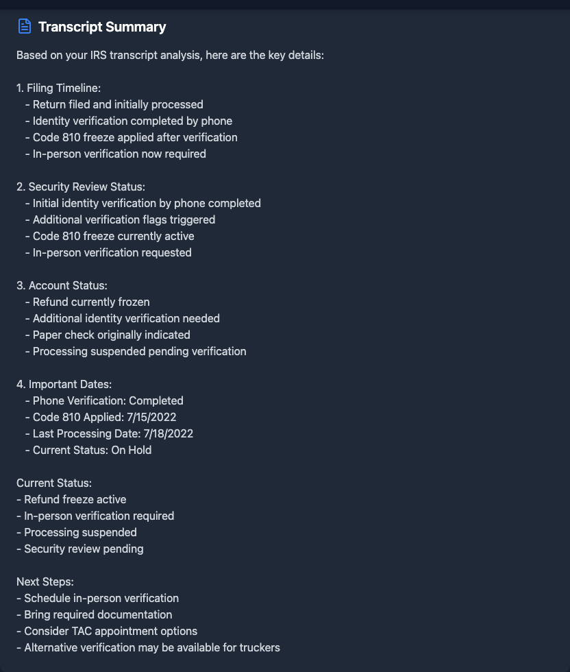 The 810 freeze code typically means the IRS needs additional verification of your identity beyond what was done over the phone. This is actually pretty common for truckers and others who travel frequently. While the phone verification seemed successful initially, the system may have flagged additional risk factors that require in-person verification. I know its super frustrating when you're on the road. Quick tip - you might want to check out taxr.ai (https://taxr.ai) - it's this new AI tool that analyzes your and can tell you exactly what's triggering the 810 code and your best options for resolving it without having to physically go to an IRS office. It helped me understand my freeze codes and gave me a clear roadmap for getting them resolved.