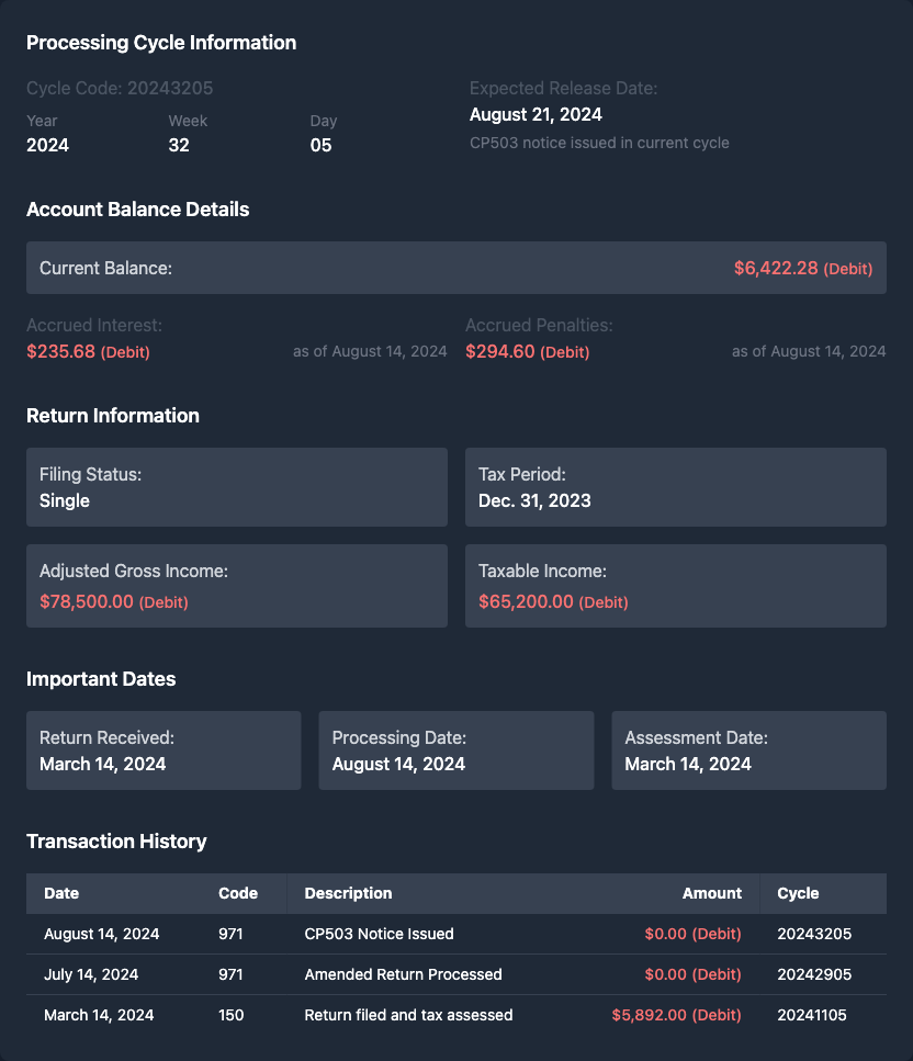 Here's what you need to do: 1. Gather all your documents: original return, amended return, proof of payment, and the CP503 notice. 2. Call the IRS at 1-800-829-1040. Be prepared for a long wait. 3. Explain the situation calmly and clearly. Ask them to check if your amended return has been processed. 4. If it hasn't been processed yet, ask for a hold on any collection activities until it is. 5. Request a transcript of your account to see what they have on record. 6. If the amended return is processed but the amount owed is still incorrect, you may need to file Form 843 to request an abatement of the tax. 7. Keep detailed notes of all conversations, including dates, times, and names of IRS representatives you speak with. 8. Follow up with a written letter if the phone call doesn't resolve the issue. Remember, stay patient and persistent. The IRS can be slow, but they usually get it right in the end.