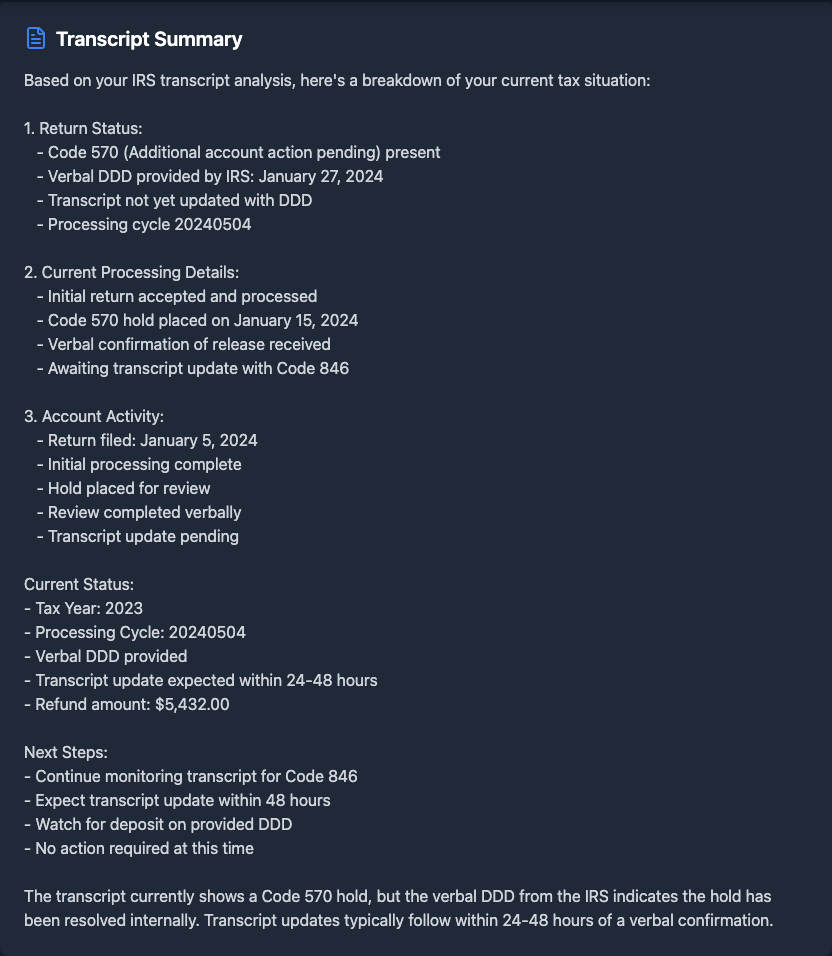 Hey everyone, wanted to share something that helped me track my refund status. I used taxr.ai and it was a game changer. It costs $4.99 but it analyzed my transcript and predicted my DDD exactly. Way better than trying to decode these codes ourselves. https://taxr.ai