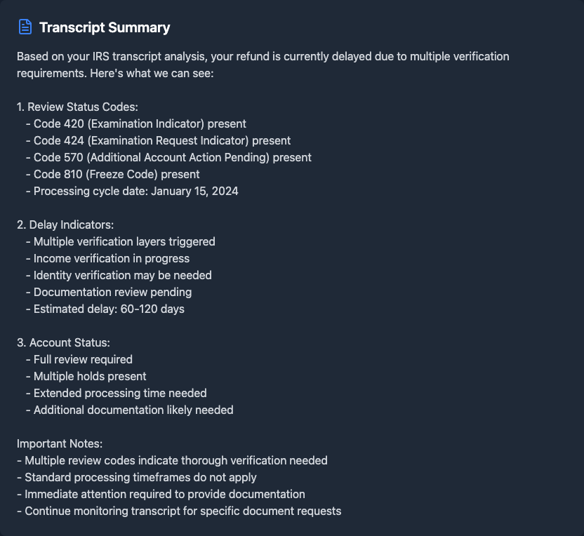 •It analyzes every line of your transcript using AI and tells you exactly why youre delayed, what to do about it, and when you'll likely get paid. Way better than guessing fr fr 💯