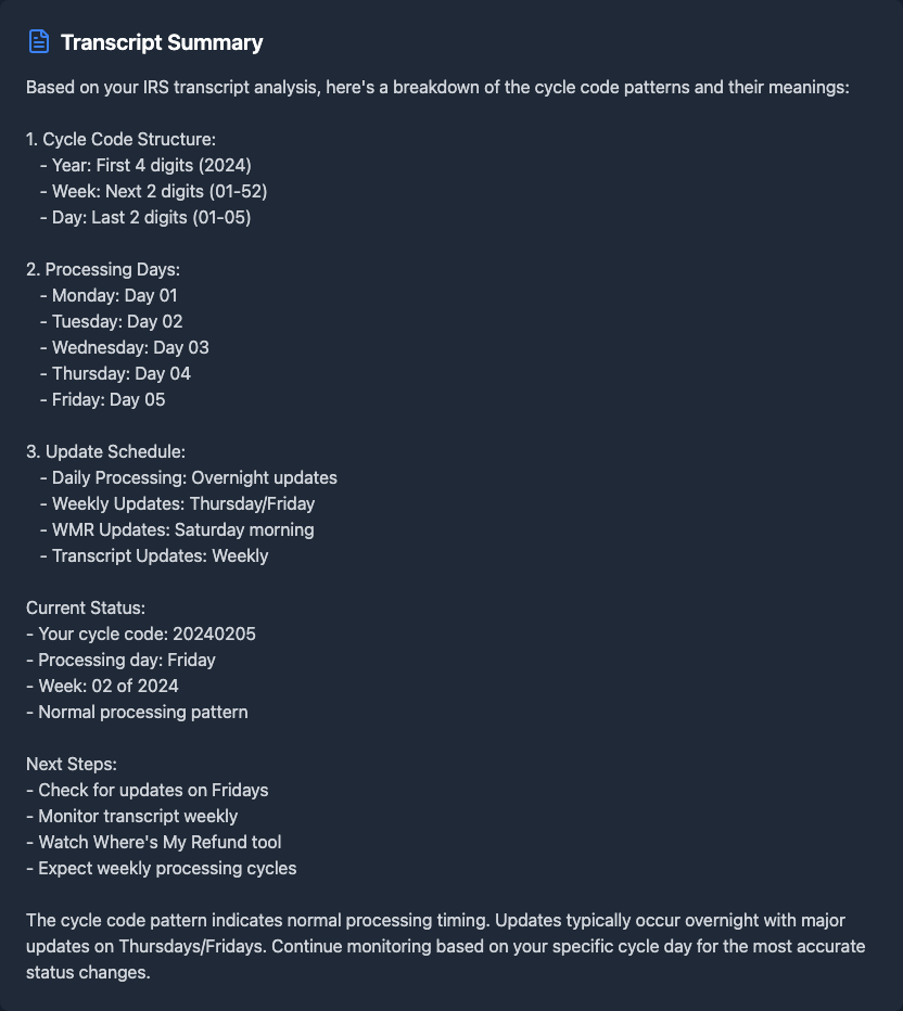 Tax pro here! Here's the cycle code breakdown: 05 is indeed Friday. 02 is Wednesday, 03 is Thursday, 01 is Tuesday, and 04 is Friday morning (rare). The first 4 digits show the year, next 2 are the week number. Example: 20231505 means 2023, week 15, Friday update.