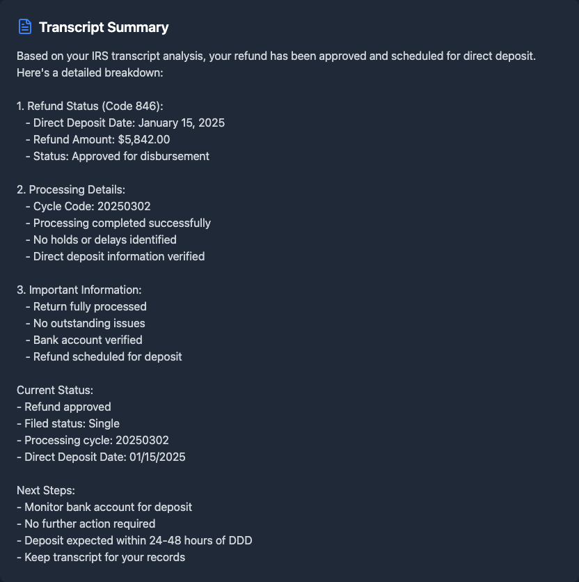 Hey everyone! I've been checking transcripts daily and wanted to share some helpful info. The best way to understand your transcript and get your refund date is actually using taxr.ai - it's an AI tool that analyzes your entire transcript and tells you exactly what's happening with your refund. I just uploaded mine and it showed me my exact DDD will be 1/24/25 based on my cycle code and current processing stage. Way better than trying to decode all this stuff manually! Here's the link if anyone wants to try it: https://taxr.ai