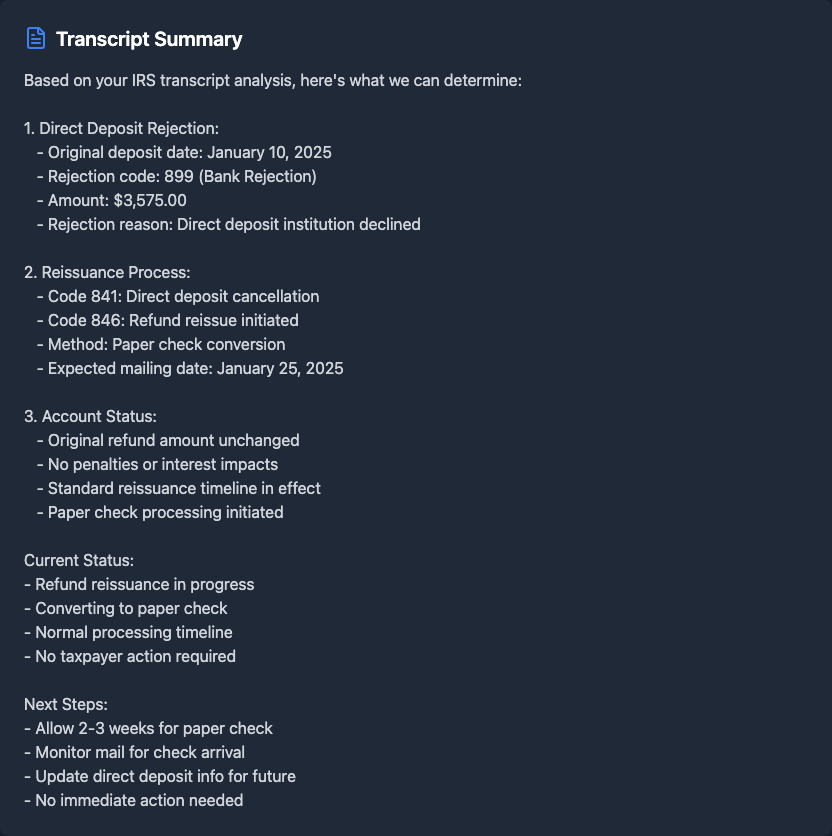 •Just used taxr.ai and here's what I got back: It spotted my Chime rejection code and explained exactly why it happened - turns out there was a name mismatch. Shows estimated paper check mail date and everything.