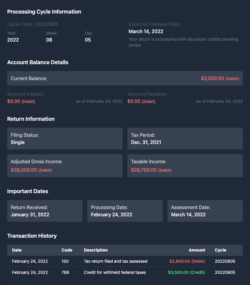 •This is such a helpful breakdown! I'm in almost the exact same situation as the original poster - I have a 766 code showing but my amount doesn't match what I filed for either. It's really reassuring to hear that the amount changing multiple times is totally normal, especially with education credits involved. I was starting to worry that something went wrong with my filing, but it sounds like this is just part of their standard processing routine. Thanks for explaining the difference between the 766 and 846 codes too - I had no idea that 766 was just the "we owe you money" code and 846 is the actual "money's coming" code. Now I know what to watch for on my transcript!