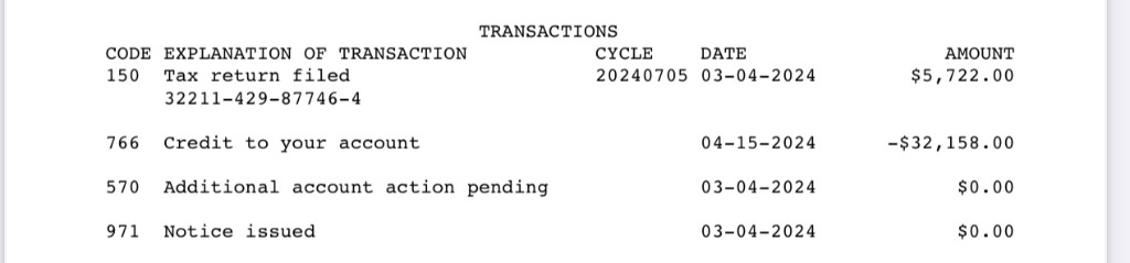 •You should get an 846 code for both of those credits (766) by 4/15. I would expect a deposit in the bank a few business days afterwards. Congratulations! 💸