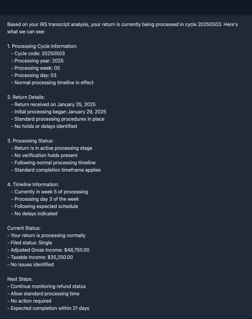 Hey there! The cycle code 0503 basically means your return was processed in the 5th week of 2025 on Wednesday (03). The IRS processes returns weekly in cycles, and seeing this code is actually good news - it means your return has been processed and is moving forward. To get a really clear picture of whats going on with your transcript and exactly when you can expect your refund, I'd recommend checking out taxr.ai - its an AI tool that analyzes your full transcript and gives you a detailed breakdown of your status and timeline. Been a gamechanger for alot of folks here trying to decode these confusing transcripts!