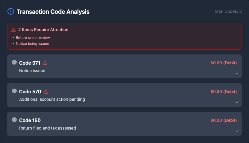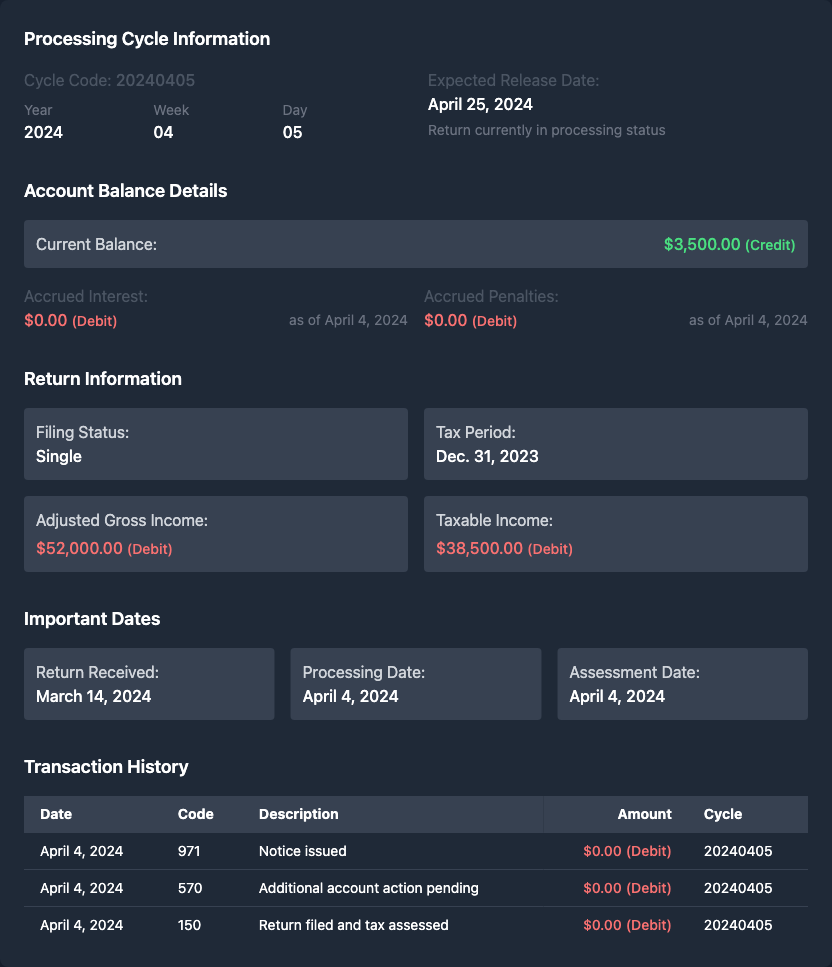 Can someone help me understand what's going on with my transcripts? I keep seeing 'processing' and cycle codes but I have no clue what any of it means. I've been waiting since February and I just want to know if I'm gonna get my refund or not. I'm looking at my Account Transcript right now from the IRS and I'm completely confused. Here's what it shows: Request Date: 02-01-2025 Response Date: 02-01-2025 ACCOUNT BALANCE: -$9,621.00 ACCRUED INTEREST: 0.00 AS OF: Feb. 18, 2025 ACCRUED PENALTY: 0.00 AS OF: Feb. 18, 2025 ACCOUNT BALANCE PLUS ACCRUALS (this is not a payoff amount): -$9,621.00 The transcript also shows this information: EXEMPTIONS: 05 FILING STATUS: Married Filing Joint ADJUSTED GROSS INCOME: $24,361.00 TAXABLE INCOME: 0.00 TAX PER RETURN: $3,338.00 SE TAXABLE INCOME TAXPAYER: $16,281.00 SE TAXABLE INCOME SPOUSE: 0.00 TOTAL SELF EMPLOYMENT TAX: $3,338.00 RETURN DUE DATE OR RETURN RECEIVED DATE (WHICHEVER IS LATER) Apr. 15, 2025 PROCESSING DATE Feb. 18, 2025 Then there's a TRANSACTIONS section with these codes: CODE EXPLANATION OF TRANSACTION - CYCLE - DATE - AMOUNT 150 Tax return filed - 20250505 - 02-17-2025 - $3,338.00 30221-423-74330-5 766 Credit to your account - 04-16-2025 - -$4,129.00 768 Earned income credit - 04-16-2025 - -$8,830.00 What do all these codes mean? What's a cycle? Does the negative account balance mean I'm getting a refund? What's that weird number 30221-423-74330-5? I filed in February but I see April dates - is that normal? I'm just trying to figure out when I might get my refund and if everything is processing correctly.
