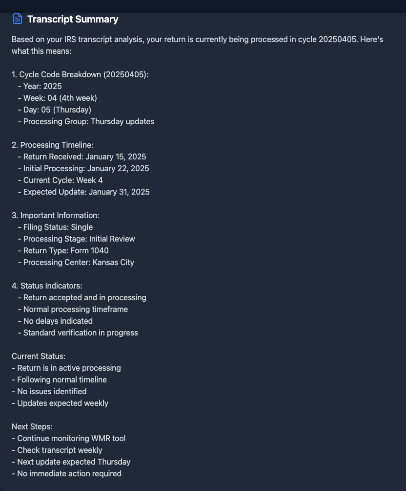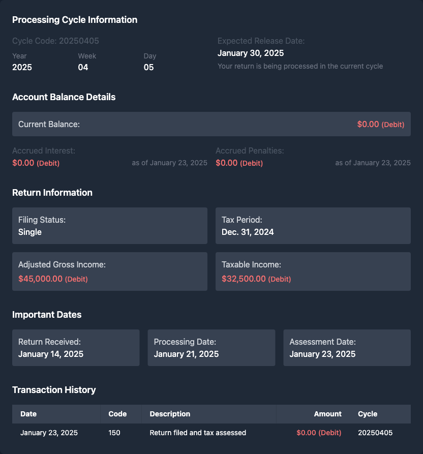 Just checked my transcripts and I'm totally lost trying to figure out my cycle code. I filed as Head of Household with 5 exemptions and my AGI was $49,018.00 with a taxable income of $27,118.00. My account transcript shows a total refund amount of $8,462.00 which I really need right now. According to my account transcript from the IRS, my return was filed with cycle code 20250503 on 02-17-2025. The transcript shows: TRANSACTIONS CODE EXPLANATION OF TRANSACTION CYCLE DATE AMOUNT 150 Tax return filed 20250503 02-17-2025 $0.00 16221-427-44348-5 806 W-2 or 1099 withholding 04-15-2025 -$2,596.00 766 Credit to your account 04-15-2025 -$3,576.00 768 Earned income credit 04-16-2025 -$2,290.00 My transcript shows "Request Date: 01-29-2025" and "Response Date: 01-29-2025" with a processing date of Feb. 17, 2025. I'm really anxious about when I'll get this money. Can someone help me understand what this cycle code 20250503 means? Does this tell me when I'll get my refund? I'm getting worried about the wait since I filed back in January and it's now showing a processing date in February. I really need to know when this $8,462.00 refund will hit my account. What does the cycle code actually mean? And do the other transaction codes tell me anything about when I'll receive my refund? I'm stressing out waiting for this money.