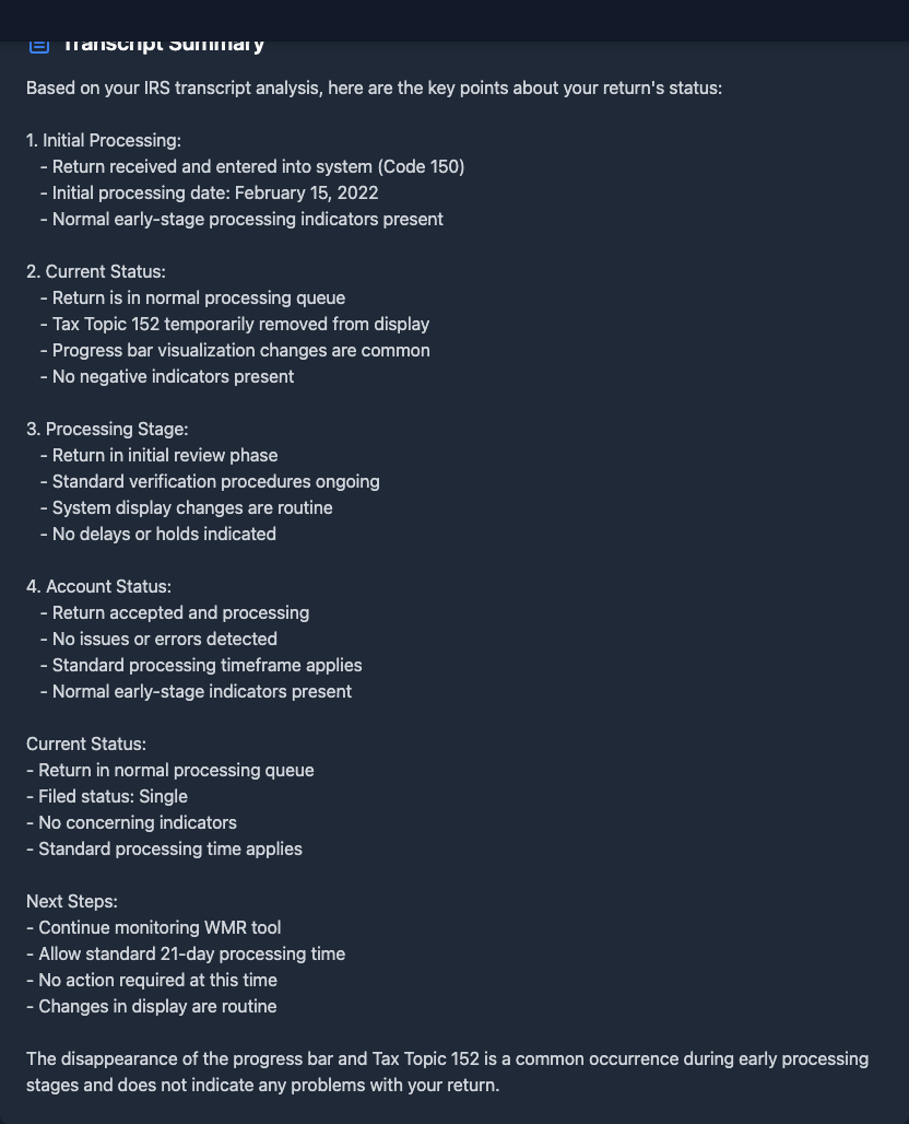 Don't worry too much! The disappearing progress bars on Where's My are super common this time of year. When the bars disappear but you still see the processing message, it usually just means your return moved to a different stage or department - not necessarily a problem. Tax Topic 152 disappearing is also normal as returns progress through the system. That said, if it's been more than 21 days since you filed, it might be worth checking your account transcript on the website to see if there are any issues or holds. The transcript will show you exactly what's happening behind the scenes with codes and dates. If you're really concerned after checking your transcript, you can try calling the IRS, though wait times are brutal right now. Most of the time though, these changes are just part of normal processing. Keep checking WMR every few days for updates!