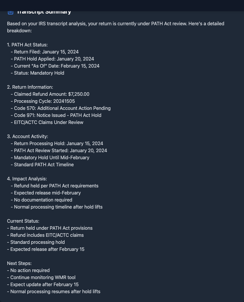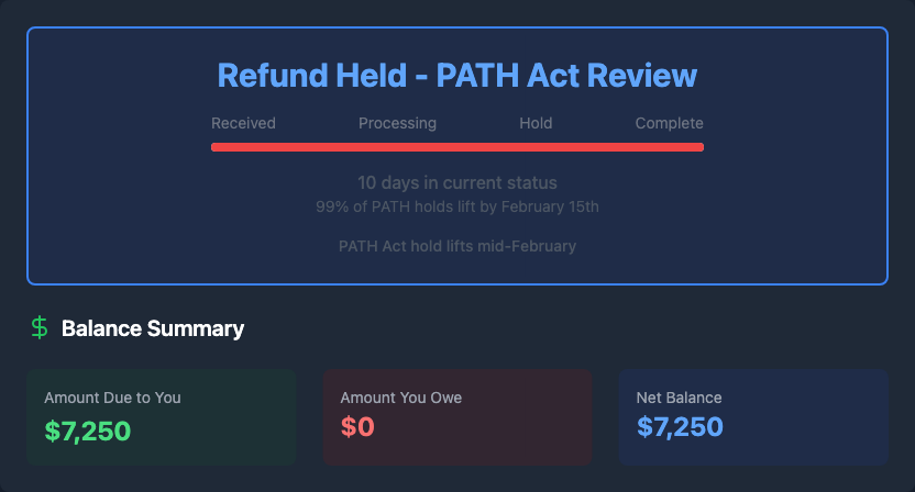 Finally got my transcripts updated for my 2023 return! Getting excited but now stuck playing the waiting game for PATH to lift. Anyone else in this boat? How long did it take for your refund after PATH lifted last year? I just checked my transcript today (01-31-2025) and I can see everything is updated now. Here's what my transcript shows: FORM NUMBER: 1040 TAX PERIOD 31, 2024 ACCOUNT BALANCE: -$11,678.00 ACCRUED INTEREST: $0.00 AS OF: Feb. 18, 2025 ACCRUED PENALTY: $0.00 AS OF: Feb. 18, 2025 ACCOUNT BALANCE PLUS ACCRUALS: -$11,678.00 I filed Head of Household with 5 exemptions. My AGI is showing as $21,723.00 with $0.00 taxable income. There's no self-employment tax since my SE taxable income is $0.00. My transcript shows: RETURN DUE DATE OR RETURN RECEIVED DATE: Apr. 15, 2025 PROCESSING DATE: Feb. 18, 2025 TRANSACTIONS: CODE EXPLANATION OF TRANSACTION CYCLE DATE AMOUNT 150 Tax return filed 20250505 02-18-2025 $0.00 806 W-2 or 1099 withholding 04-16-2025 -$215.00 766 Credit to your account 04-16-2025 -$3,733.00 768 Earned income credit 04-17-2025 -$8,830.00 I'm getting a nice refund of $11,678.00 total, but now I have to wait for PATH to lift since I claimed EIC. The waiting is killing me, especially since everything else seems processed and ready to go! Has anyone who went through this last year remember how long it took after PATH lifted to actually get their refund? Did it come quickly or was there another delay?