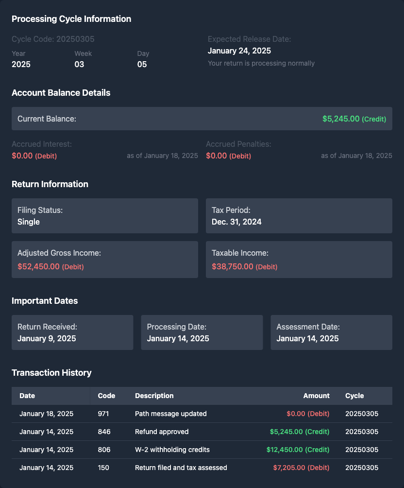 Hey, you should check out taxr.ai - it analyzes your transcript and tells you exactly what's happening and when to expect your refund. Its only $4.99 but totally worth it to stop the guessing game. https://taxr.ai