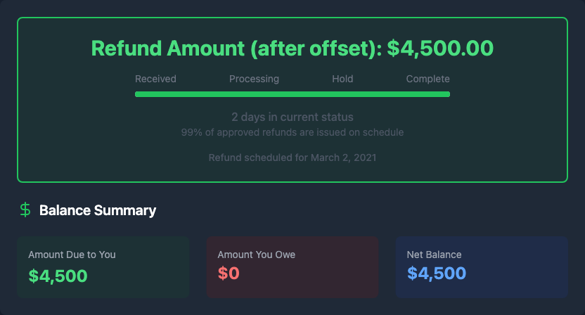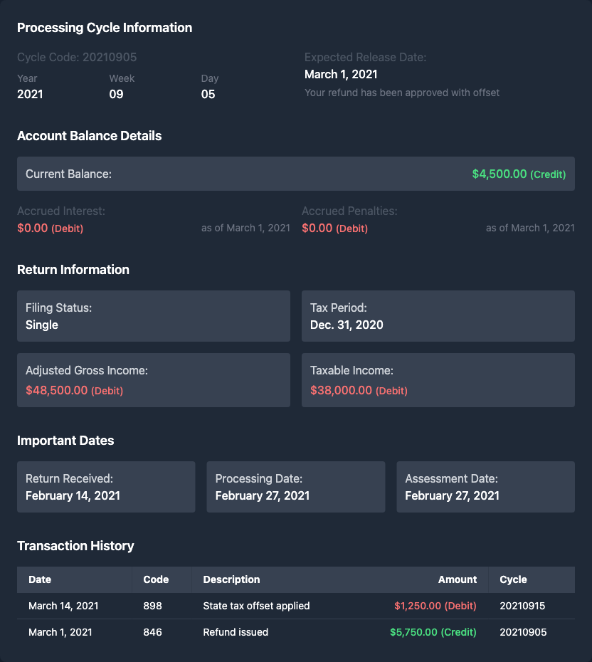 •ok fam i tried taxr.ai and here's what it told me: Status: Scheduled for release Expected Date: 3/2/2021 Offset Amount: $1,243 (State Tax) Net Refund: $3,757 This is actually super helpful ngl, saved me hours of googling 🙌