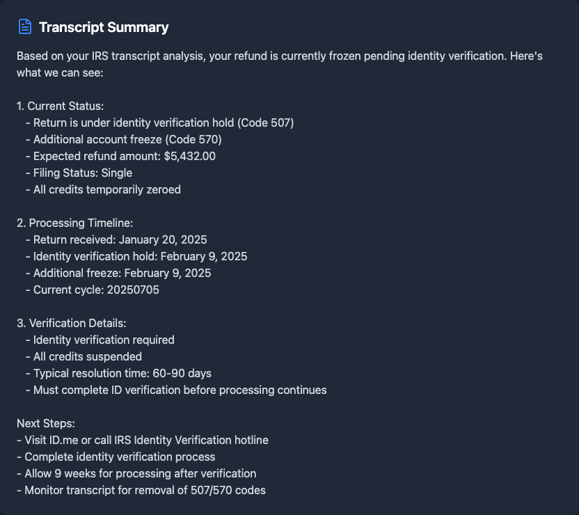 •it analyzes pretty much any tax doc - transcripts, w2s, notices, returns etc. gives u specific timeline predictions and tells u how to fix issues