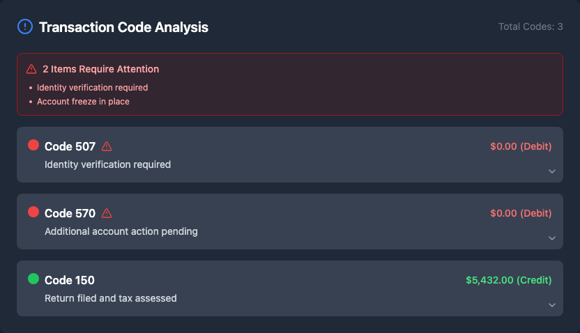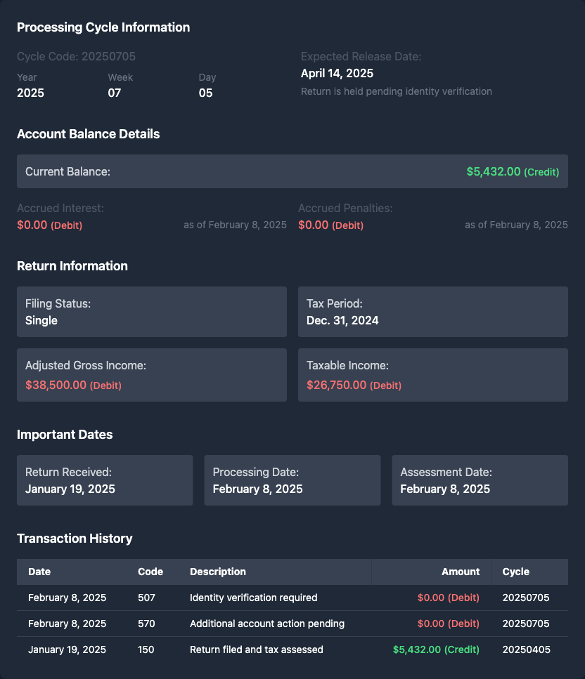 I just checked my 2024 tax transcript and noticed something concerning. My account has a 507 code that I've never seen in previous years. Looking at the details, my tax return was filed (code 150) with a processing date of Feb 24, 2025 and shows a cycle number of 20250605. Here's what I'm seeing on my transcript: RETURN DUE DATE OR RETURN RECEIVED DATE (WHICHEVER IS LATER) Apr. 15, 2025 PROCESSING DATE Feb. 24, 2025 TRANSACTIONS CODE EXPLANATION OF TRANSACTION CYCLE DATE AMOUNT 150 Tax return filed 20250605 02-24-2025 $0.00 70211-428-41669-5 806 W-2 or 1099 withholding 04-15-2025 766 Credit to your account 04-15-2025 768 Earned income credit 04-15-2025 570 Additional account action pending 03-03-2025 $0.00 This Product Contains Sensitive Taxpayer Data There's code 570 showing "Additional account action pending" with a date of March 3, 2025. The transcript shows pending W-2/1099 withholding (code 806), credits (code 766), and earned income credit (code 768) all dated for April 16, 2025. Has anyone dealt with these codes before, especially the 570 with pending account action? I'm worried about what this means for my refund timeline since I've got multiple credits pending including EIC. What's strange is all these amounts are showing $0.00 where there should be values. I filed with W-2 withholding and claimed earned income credit, but the transcript isn't showing any dollar amounts for these entries. Is this normal to see all these codes with $0.00 amounts? I'm especially concerned about what the "Additional account action pending" means and why it has a date of March 3, 2025, which is before the April 15 date shown for the credits. My cycle number is 20250605 if that helps with interpreting what's happening. Anyone know what this combination of codes and dates typically indicates for refund processing? Will I still get my refund on time?