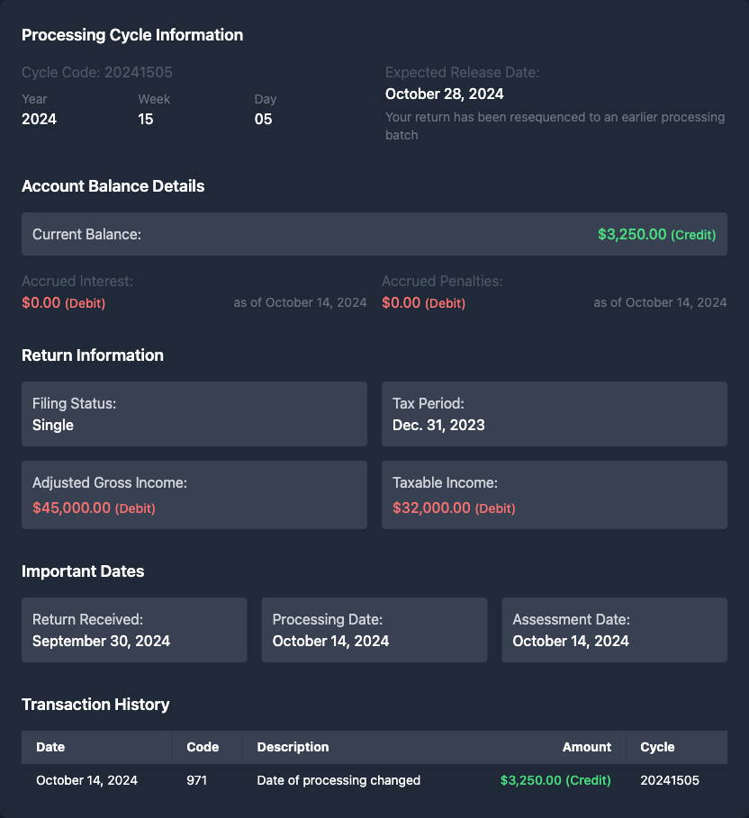 I've been checking my transcript daily and noticed something weird. The processing date was showing 11/25/24 but now its showing an earlier date of Feb. 19, 2024. Really confused about what this means for my refund situation. Looking at my transcript, I see: RETURN DUE DATE OR RETURN RECEIVED DATE (WHICHEVER IS LATER) Apr. PROCESSING DATE Feb. TRANSACTIONS CODE EXPLANATION OF TRANSACTION CYCLE DATE AMOUNT 150 Tax return filed 20240503 02-19-2024 30221-419-08250-4 768 Earned income credit 04-15-2024 846 Refund issued 02-22-2024 971 Amended tax return or claim 06-10-2024 forwarded for processing 977 Amended return filed 06-10-2024 43277-564-01625-4 810 Refund freeze 06-27-2024 766 Credit to your account 04-15-2024 765 Reduced or removed earned income 04-15-2024 credit 766 Credit to your account 04-15-2024 290 Additional tax assessed 20243805 10-07-2024 33254-656-05849-4 It shows my original refund was issued on 02-22-2024, but then I filed an amended return on 06-10-2024. Then there's a refund freeze from 06-27-2024. Now I see there was additional tax assessed on 10-07-2024. The most concerning part is that code 765 which shows they reduced or removed my earned income credit. There are also two 766 codes for credits to my account. My tax period ends Dec. 31, 2023. I filed as single. Why would the processing date suddenly show February instead of November? Does this mean they're starting over with my amended return processing? I'm particularly worried about the refund freeze (code 810) and what the additional tax assessment means for me. The cycle date changed too. Anyone else seeing dates move backwards on their transcript like this? Should I be worried about the earned income credit being reduced or removed?